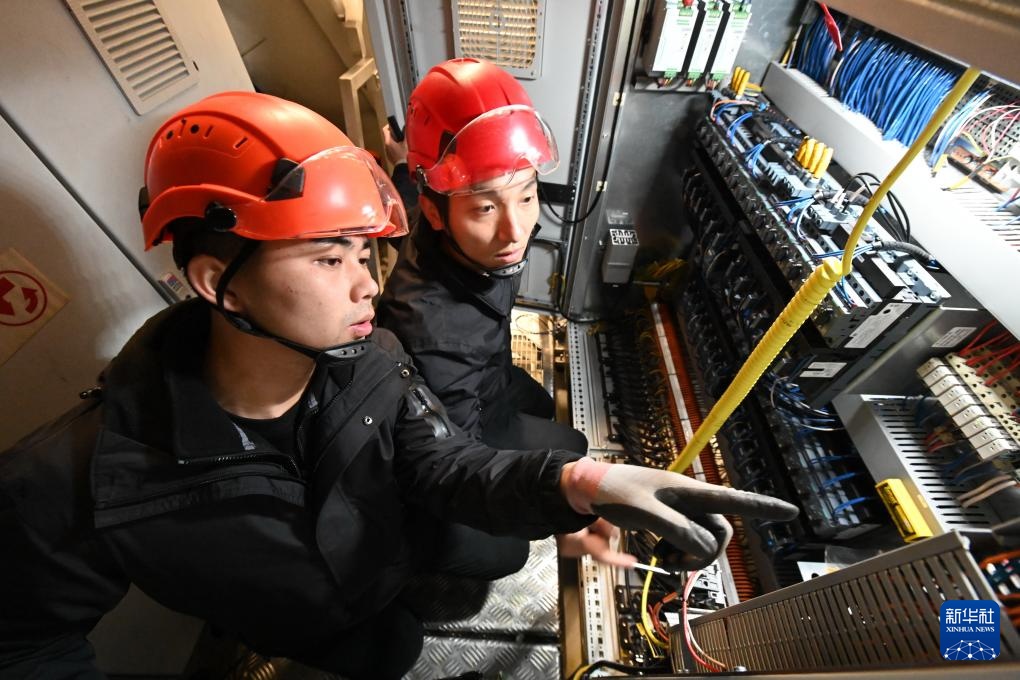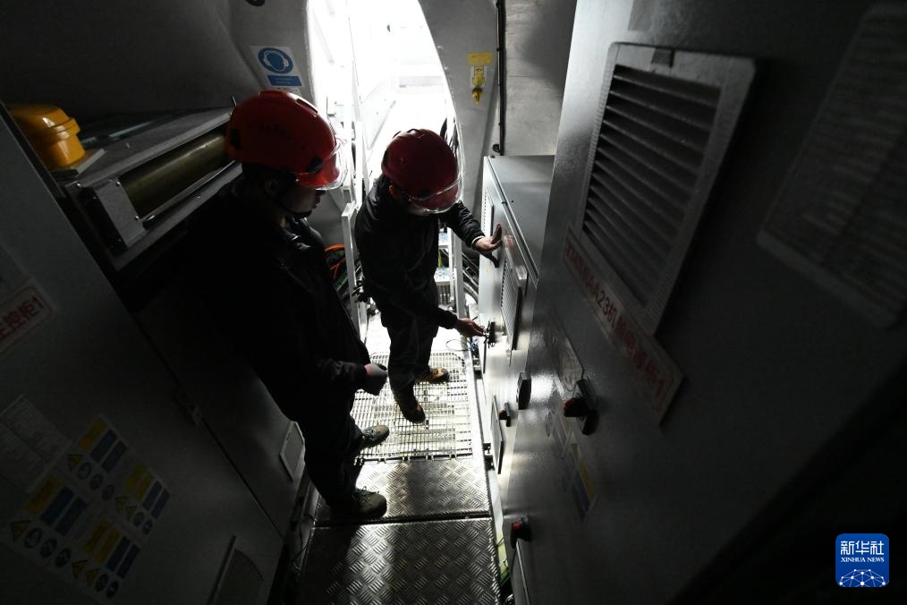 1月19日,黄志明(右)和同事在风机机舱内进行故障处理。