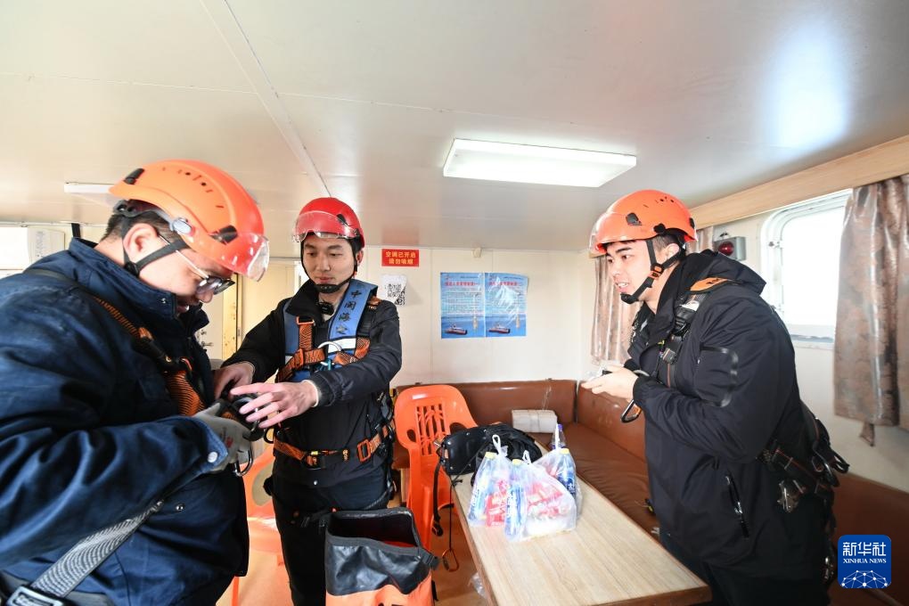 1月19日,黄志明(中)在运维船上帮同事穿戴个人防护装备。