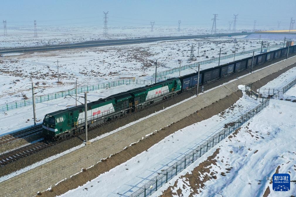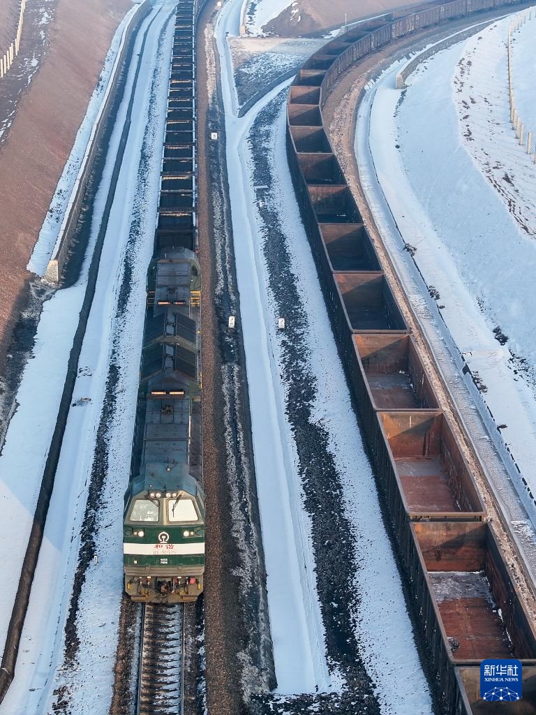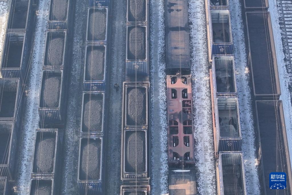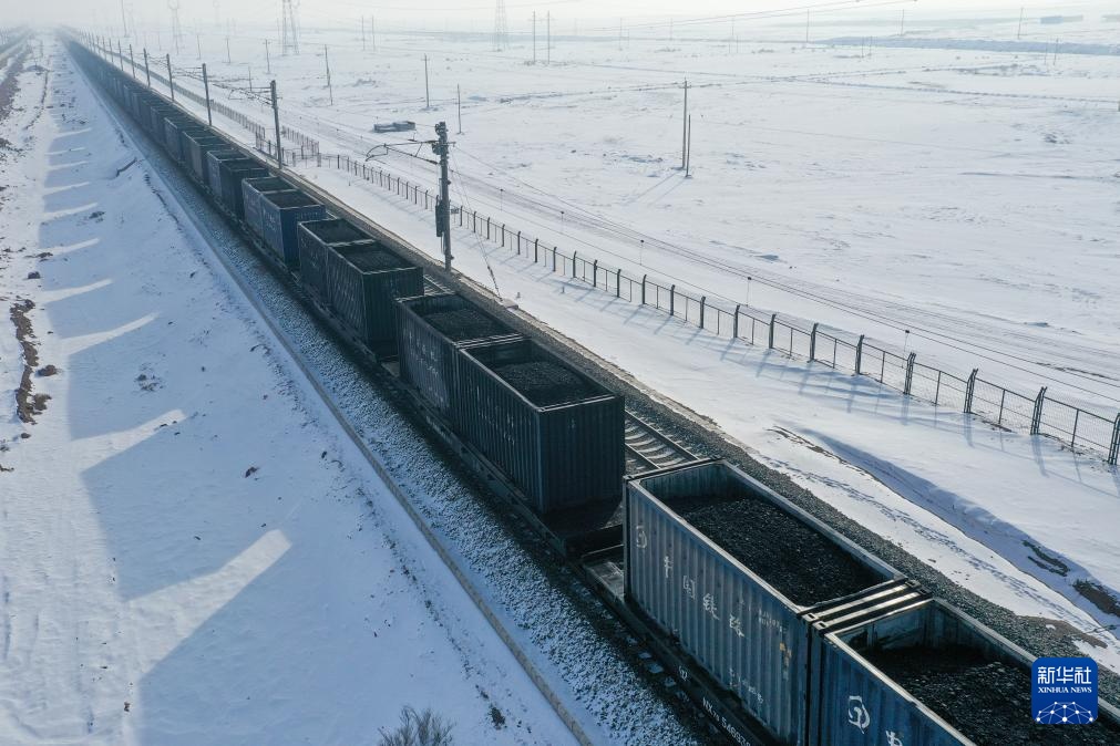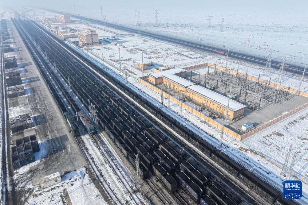 装运煤炭的出疆货运列车停靠在新疆将军庙站(1月21日摄,无人机照片)。