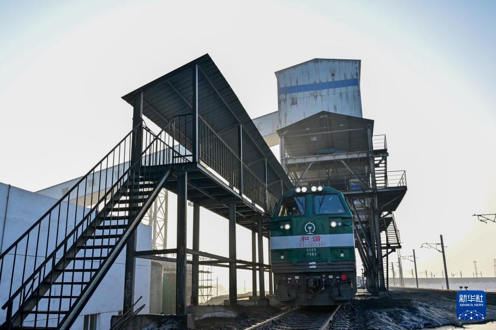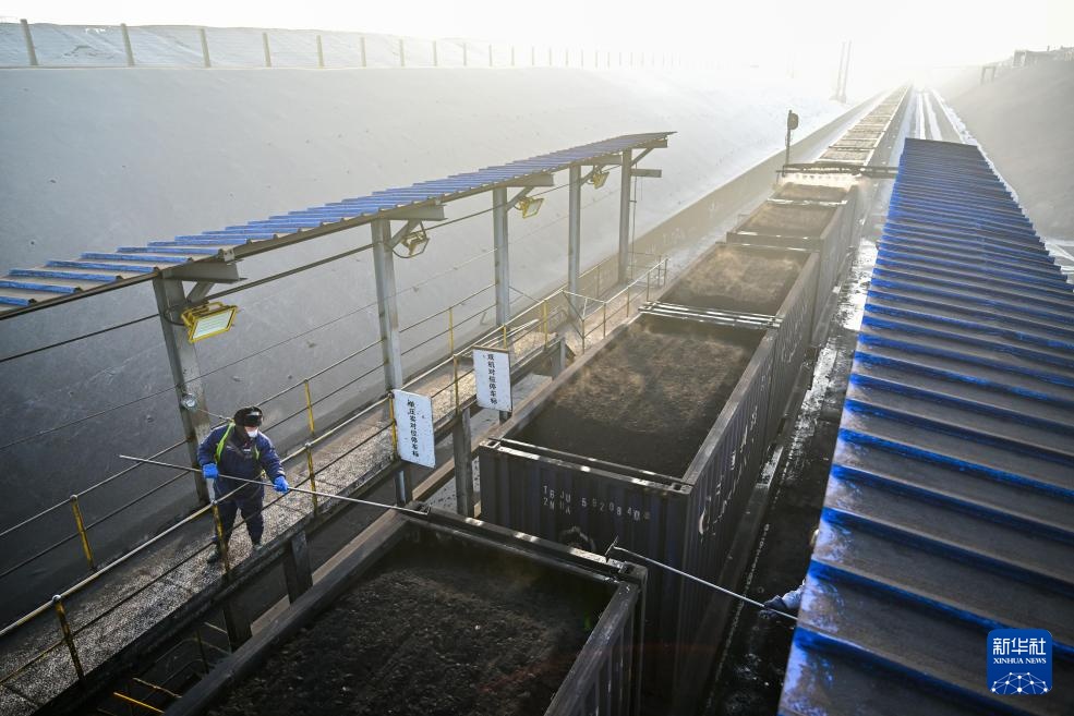 在新疆准东经济技术开发区内的新疆宜化矿业有限公司煤矿快装站,工作人员操作设备为出疆的“百辆万吨”货运列车装煤(1月20日摄)。