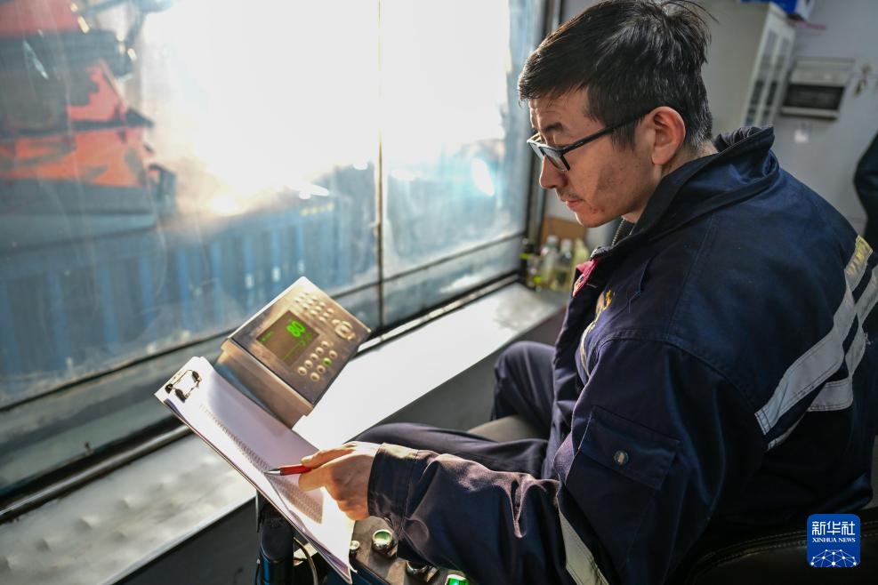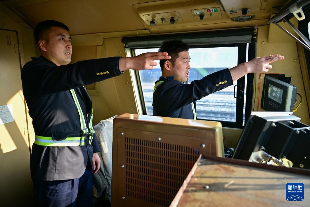 在新疆红沙泉站,“百辆万吨”货运列车的机车乘务员在确认发车信号(1月21日摄)。