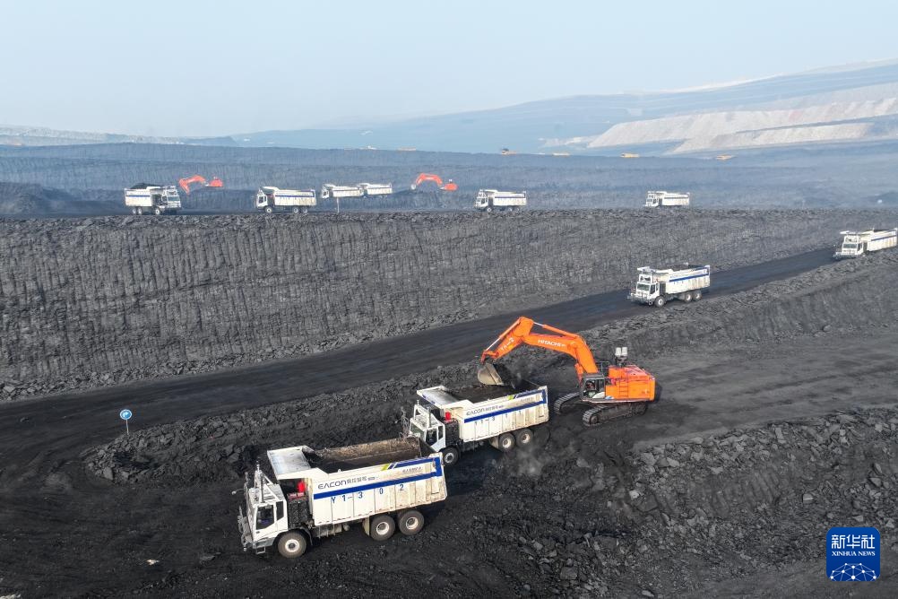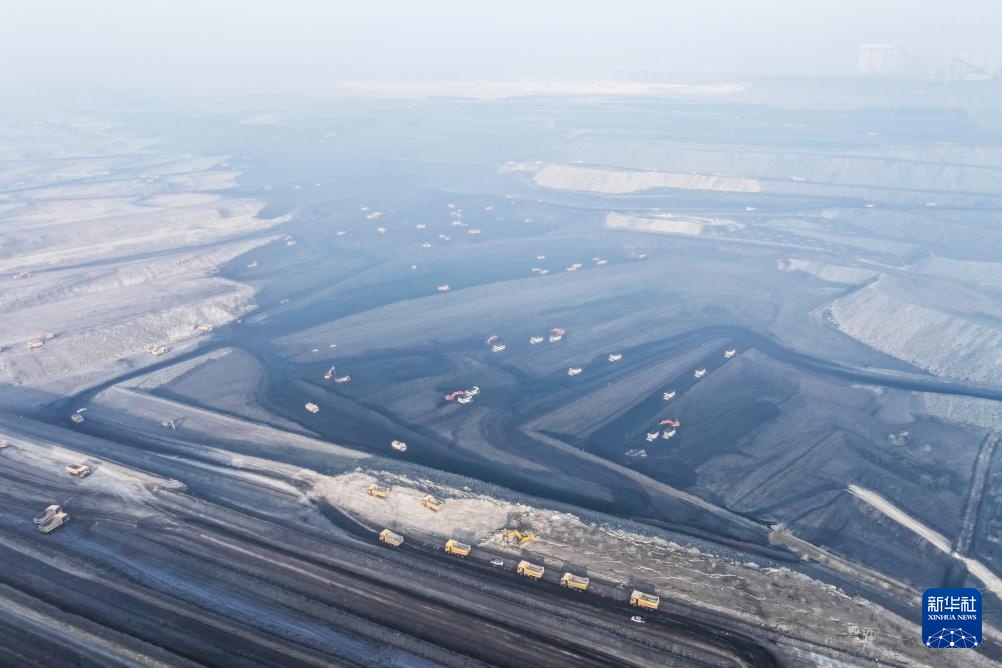 在新疆准东经济技术开发区内的新疆宜化矿业有限公司五彩湾矿区一号露天煤矿,无人驾驶矿卡进行煤炭装载作业(1月20日摄,无人机照片)。