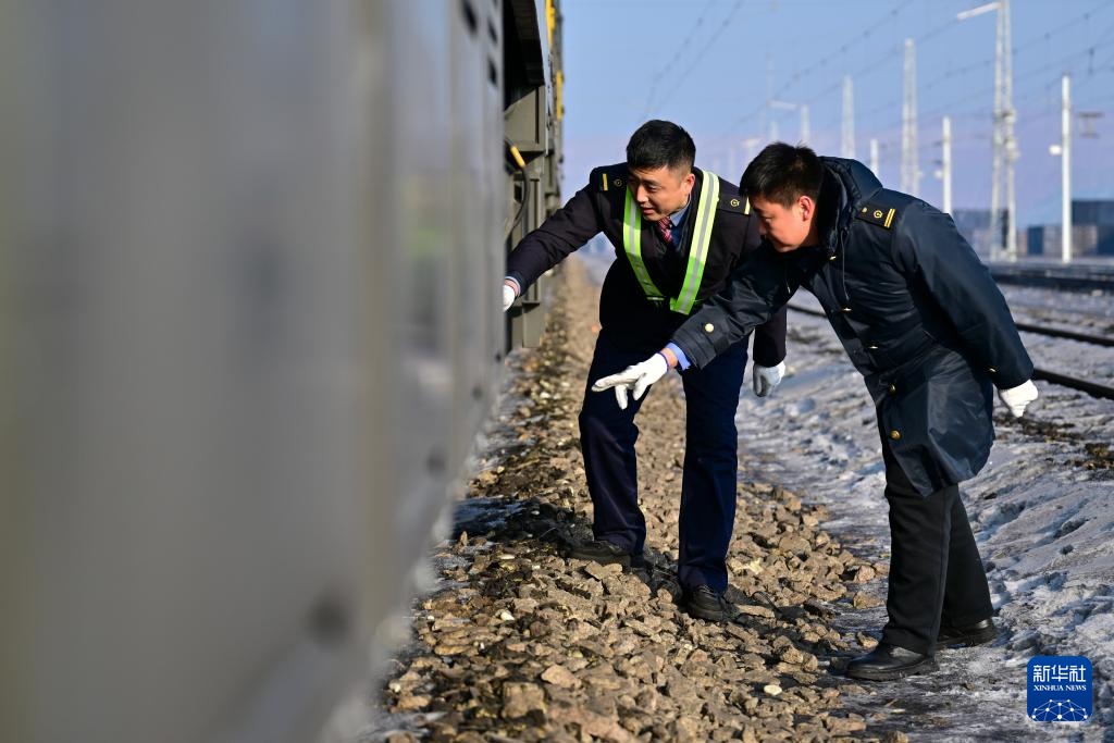 在国能新疆准东能源有限责任公司准东露天煤矿快装站,检车员对装运煤炭的“百辆万吨”货运列车集装箱进行检查(1月21日摄)。