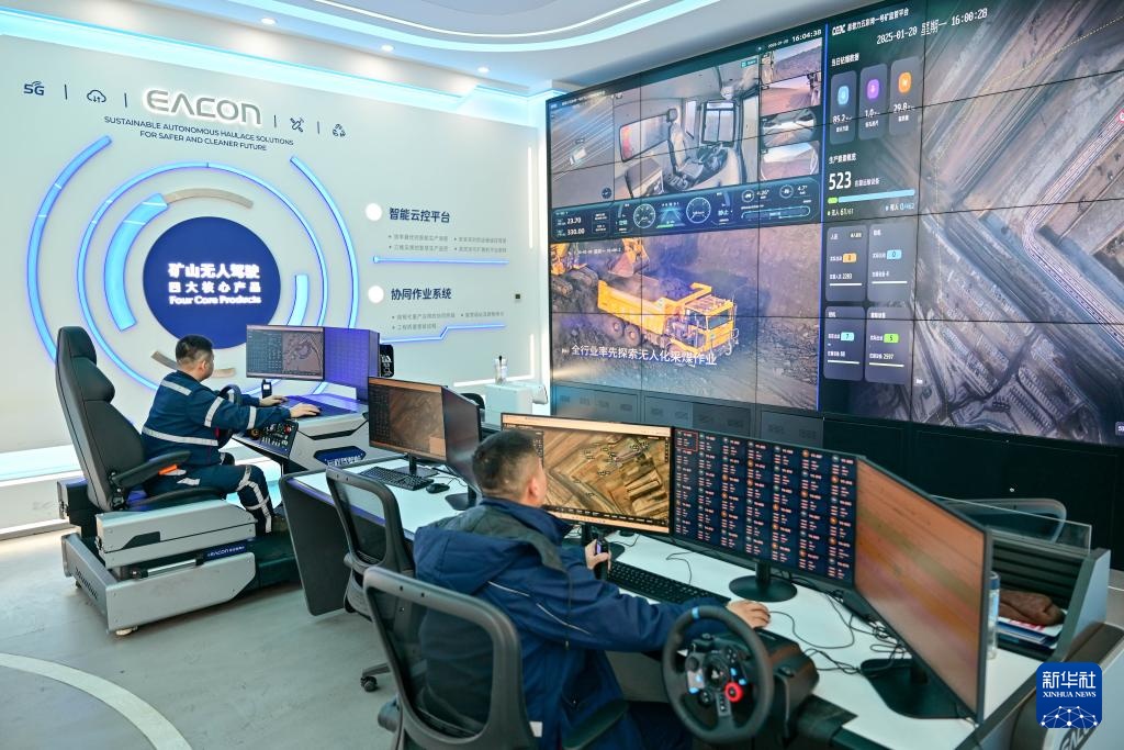 在新疆准东经济技术开发区内的新疆宜化矿业有限公司五彩湾矿区一号露天煤矿,工作人员在智能云控中心对车辆进行调配、线路规划和监测(1月20日摄)。