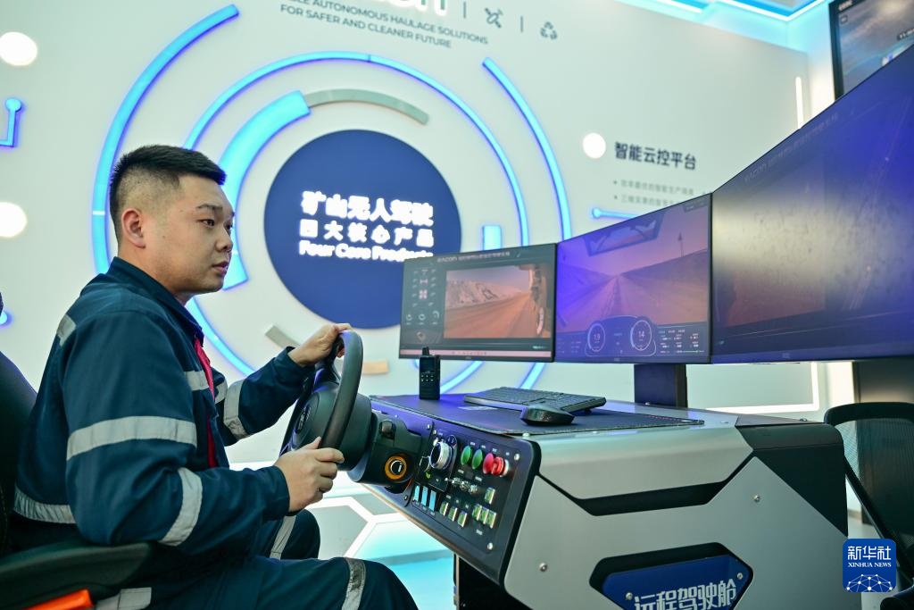 在新疆准东经济技术开发区内的新疆宜化矿业有限公司五彩湾矿区一号露天煤矿,工作人员手握方向盘时刻准备介入遇到突发情况的无人驾驶车辆(1月20日摄)。