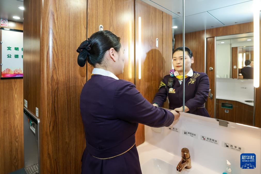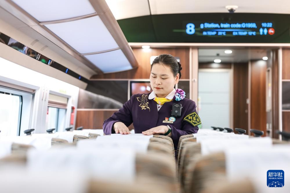 1月22日,杭州客运段列车长祝玲丽在高铁热备动车组车厢内检查客运设备。