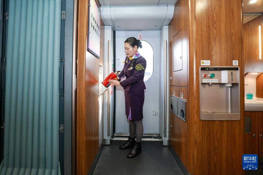 1月22日,杭州客运段列车长祝玲丽在高铁热备动车组车厢内检查消防设备。