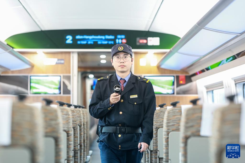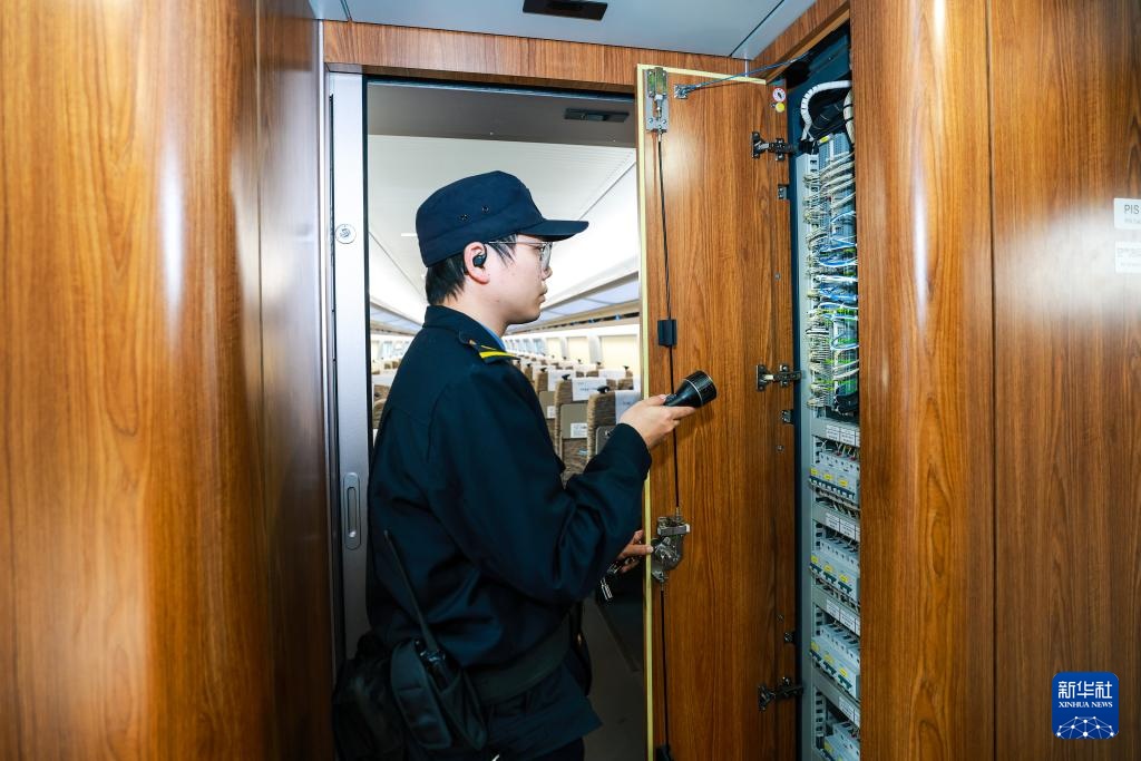 1月22日,上海动车段随车机械师邱宇在高铁热备动车组车厢内巡检。