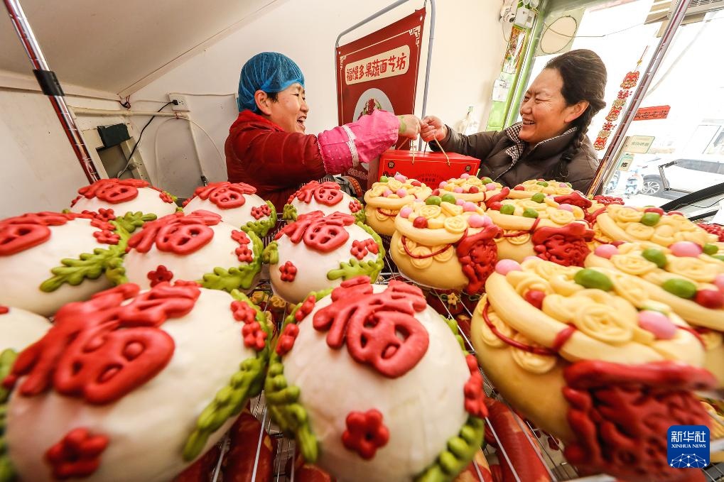 1月22日,顾客在河南省商丘市睢阳区一家花馍店购买花馍。