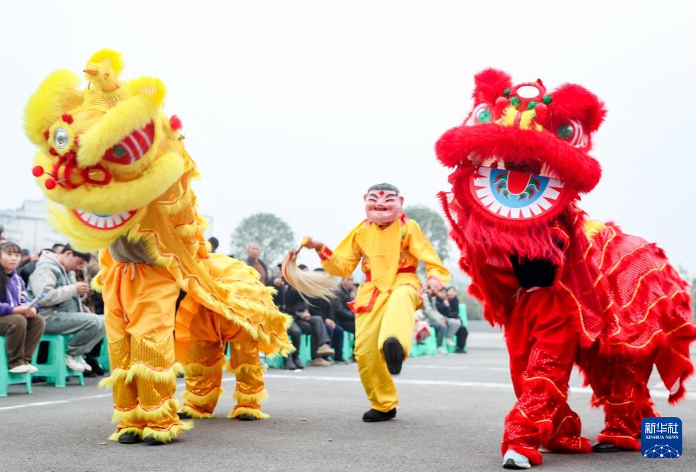 1月21日,民间艺人在四川省广安市高兴镇花庙嘴村为乡亲们表演舞狮。
