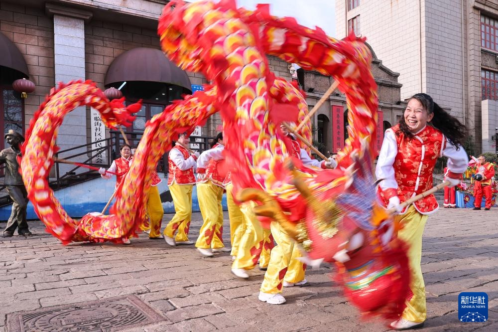 1月22日,民间艺人在江苏连云港市连云老街表演舞龙。