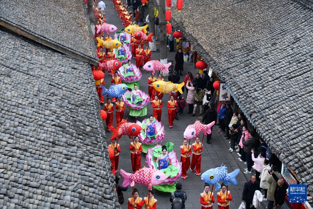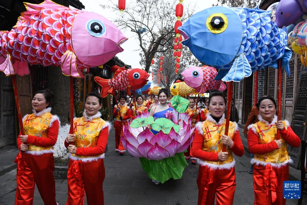 1月22日,在四川省阆中市,非遗民俗表演队伍在古城街道巡游。