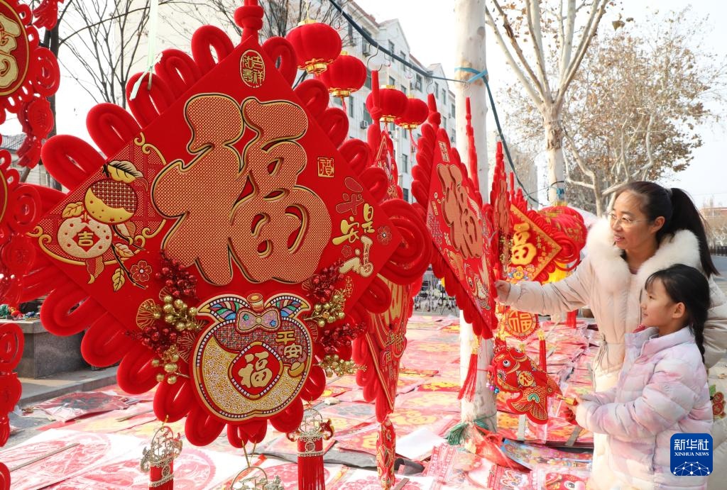 1月22日,在山东省滨州市博兴县年货大集,一对母子在选购中国结。