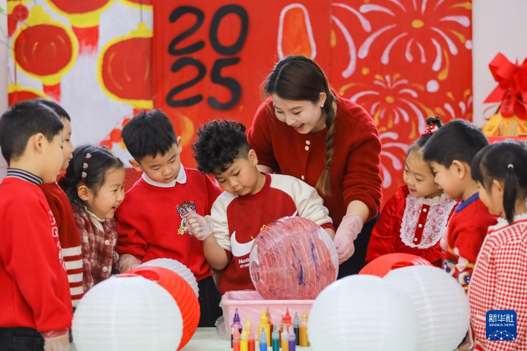 1月22日,在山东省青岛市李沧区世园幼儿园迎新春主题活动中,老师指导小朋友体验创作漂漆灯笼。