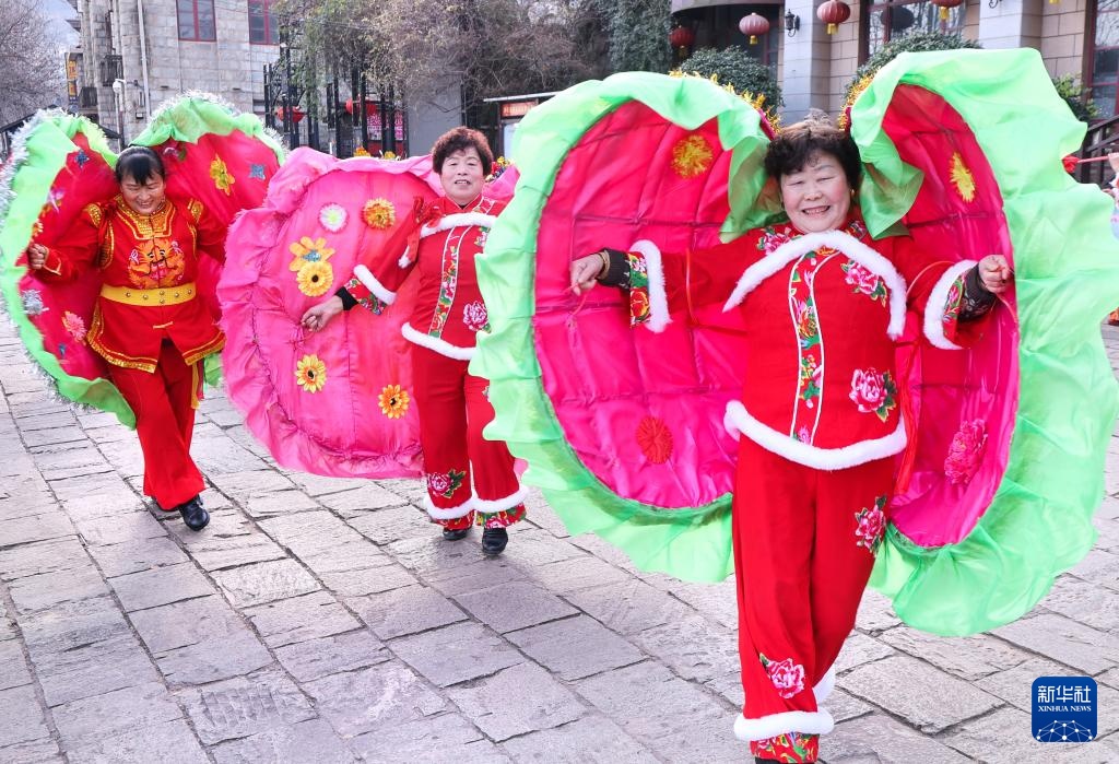 1月21日,民间艺人在湖北省襄阳市唐城景区表演舞蹈。