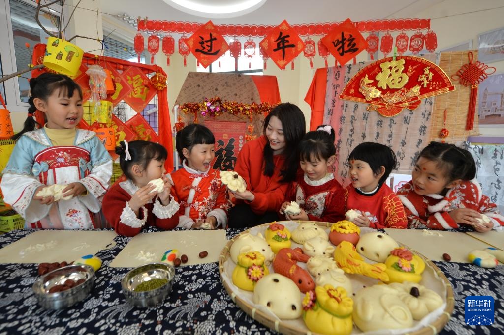 1月21日,在山东青岛高安路幼儿园开展的“学年俗 品年味”主题活动上,老师指导小朋友们学做枣饽饽。