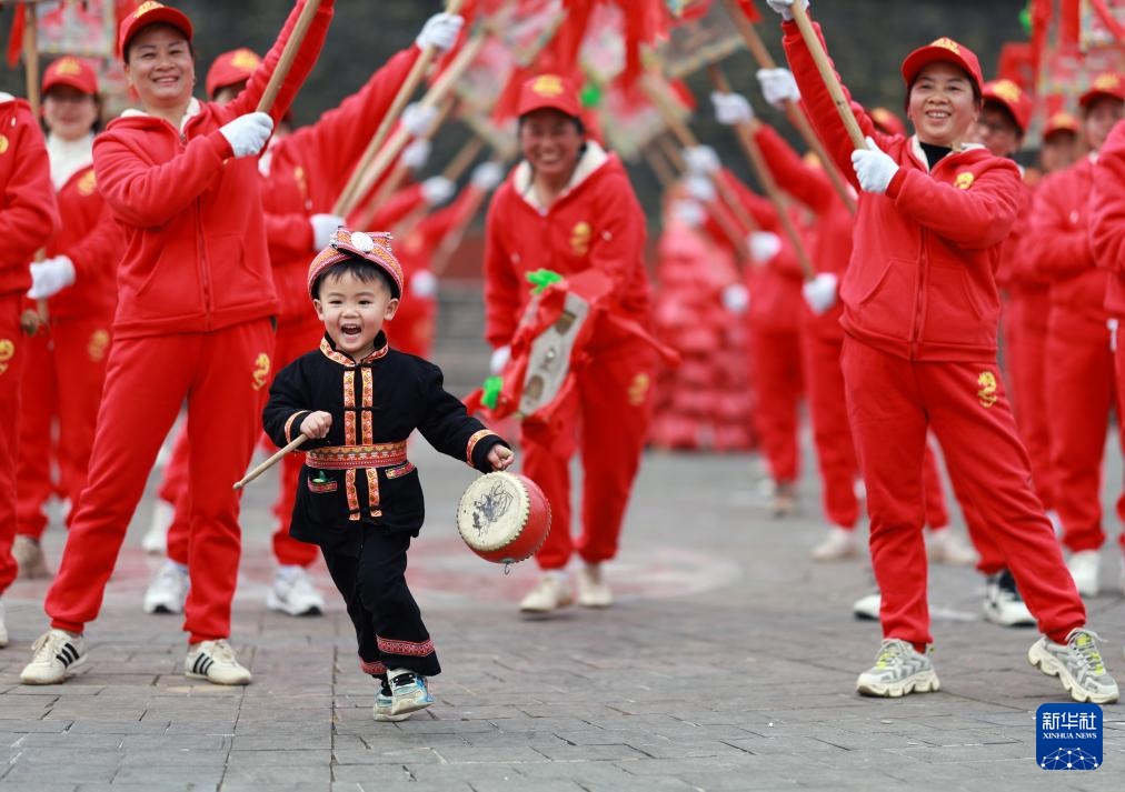 1月22日,在广西桂林市灵川县兰田瑶族乡的牌灯展演现场,一名小朋友参与互动。