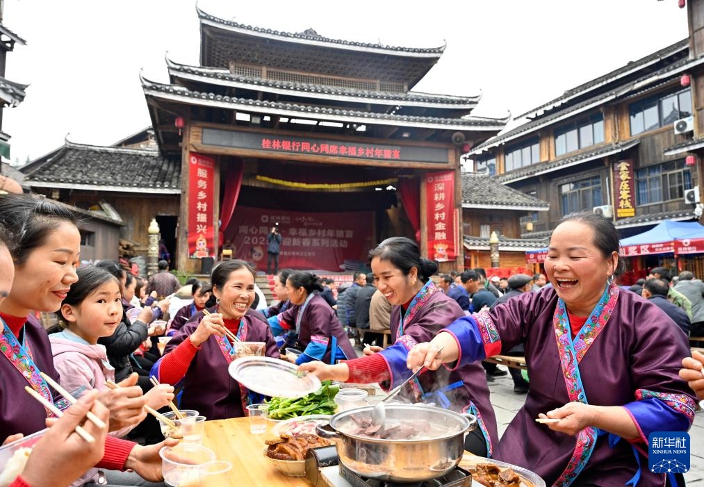 1月22日,在广西柳州市三江侗族自治县林溪镇平岩村岩寨屯,村民在岩寨鼓楼前品尝“年猪宴”。
