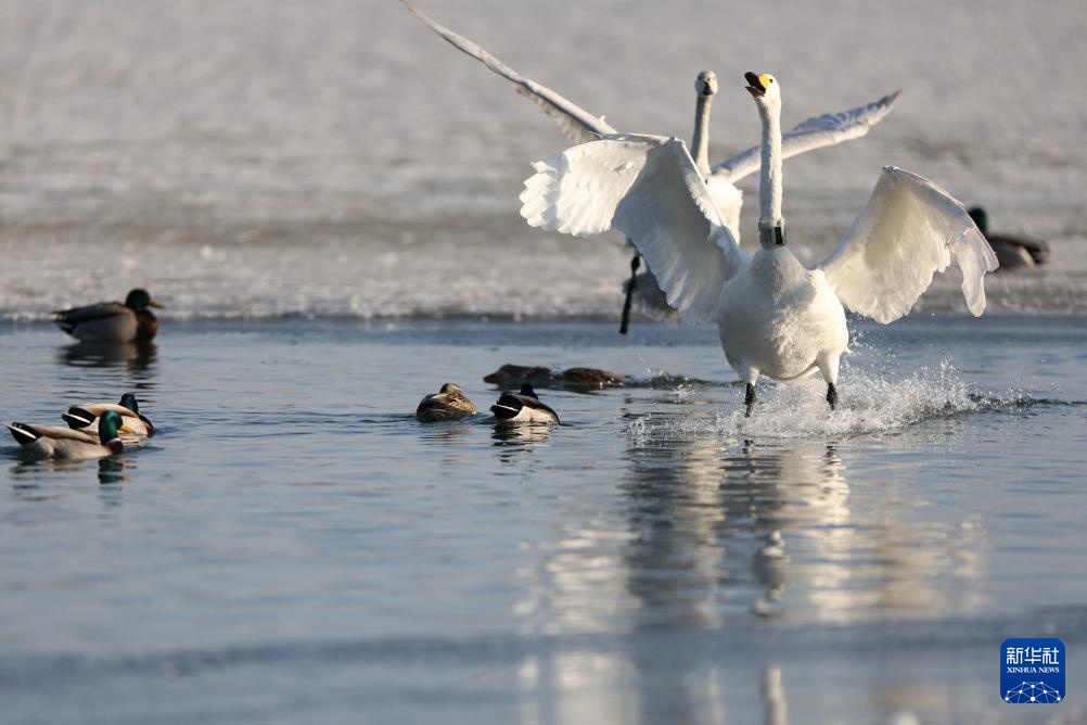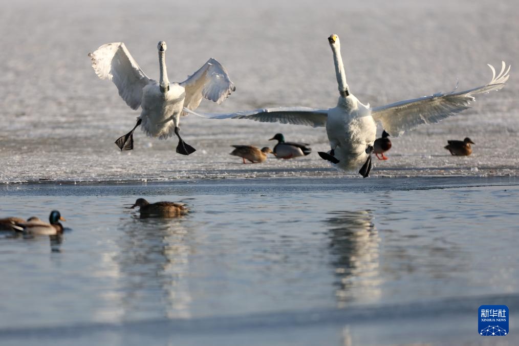 1月22日,大天鹅在甘肃省张掖市国家湿地公园内嬉戏。