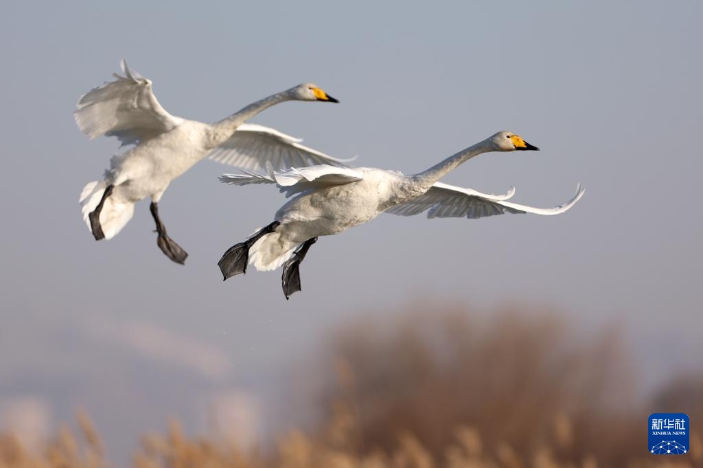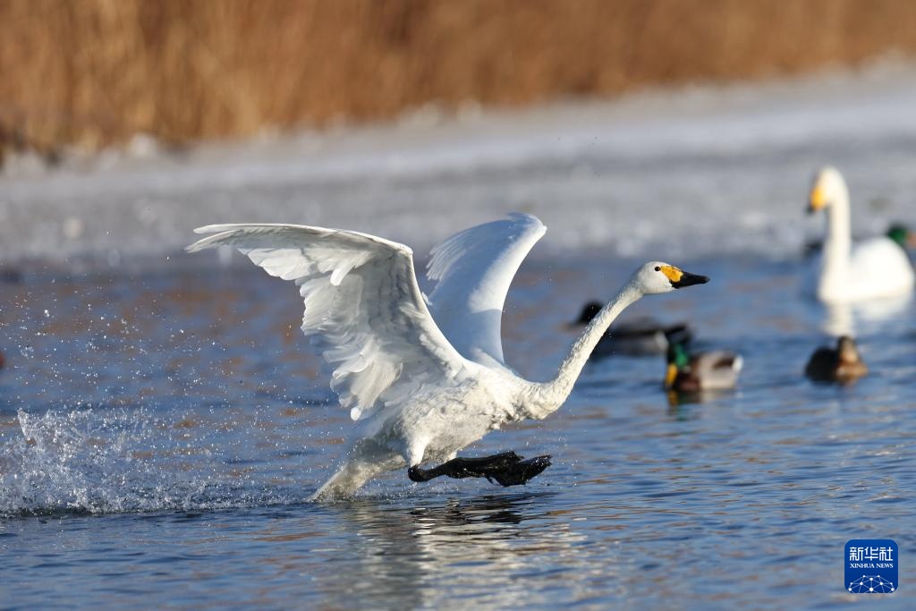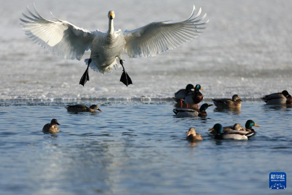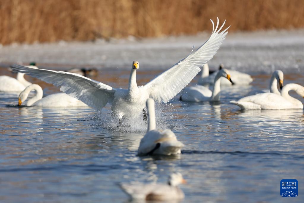 近日,甘肃省张掖市国家湿地公园迎来大批越冬的大天鹅在此栖息、觅食,灵动的身影为冬日的湿地增添了生机。近年来,张掖市不断加大生态保护力度,湿地生态得到持续改善,每年吸引大批候鸟来此越冬。