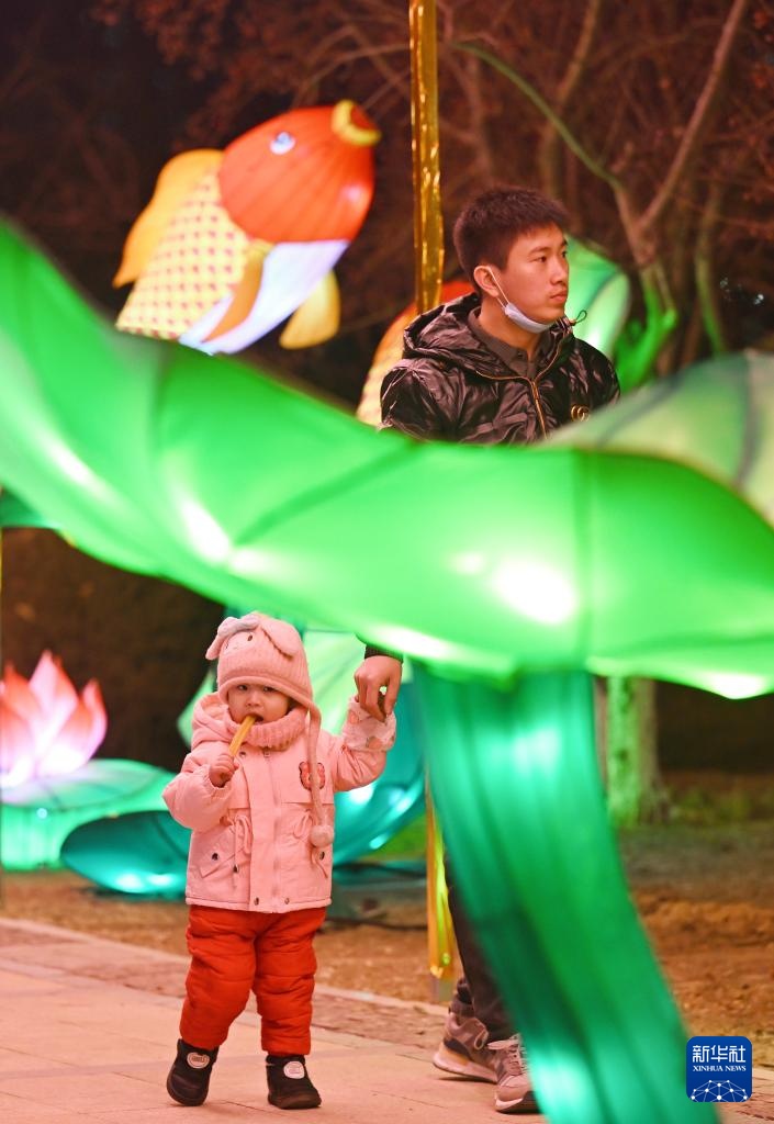 1月22日,家长带着小朋友在第二届津彩大灯会游览。