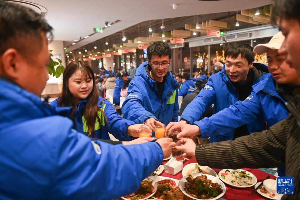 1月22日,快递员和家属在“年夜饭”活动上碰杯。