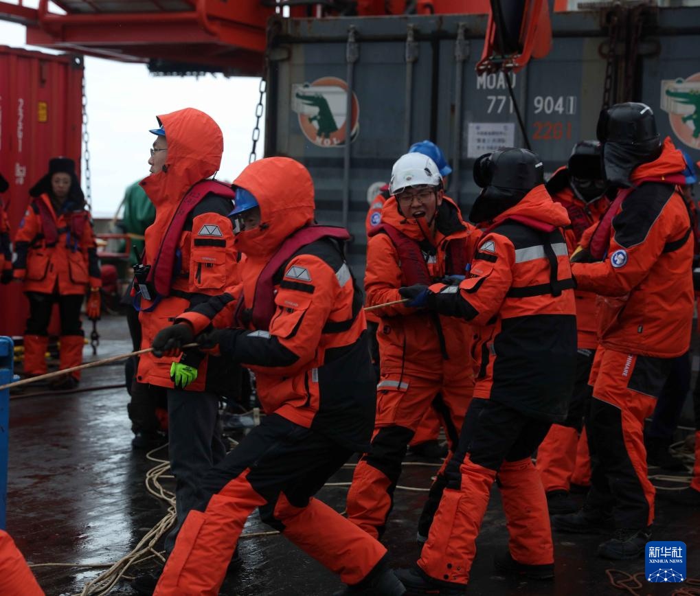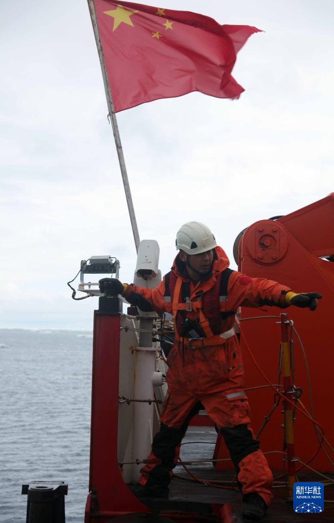 考察队员在甲板回收生态潜标(1月19日摄)。