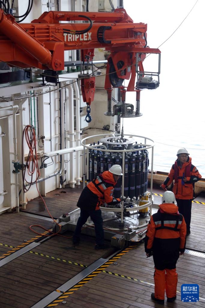 考察队员从CTD(温盐深剖面仪)中采集极地海水样本(1月18日摄)。