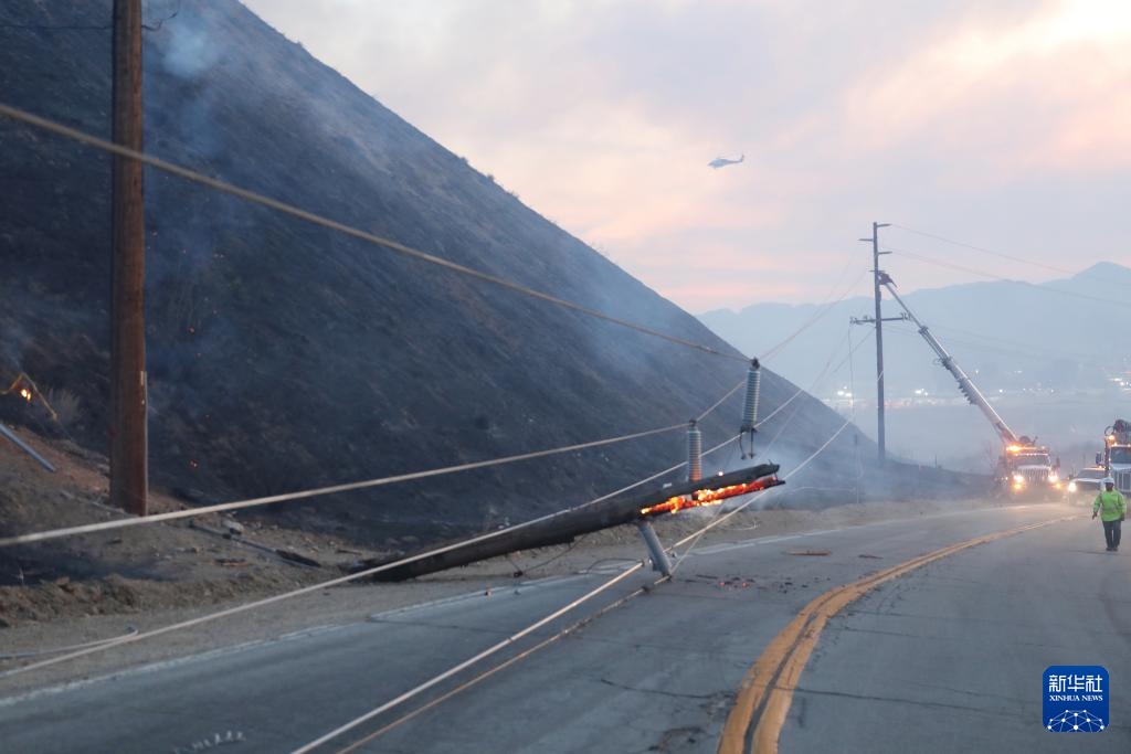 1月22日,在美国加利福尼亚州洛杉矶县卡斯泰克市的一座山丘上,电线杆因山火受损。