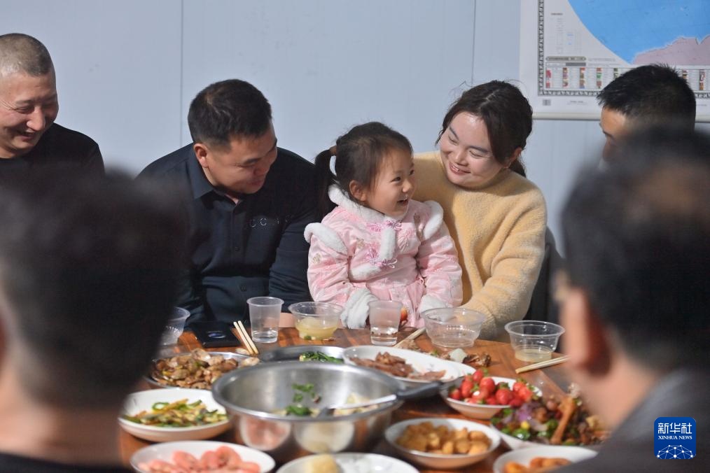 在柳州市柳江区三都镇鱼宜高速公路建设工地,中铁二十局工人和家属在餐厅吃团圆饭(1月22日摄)。
