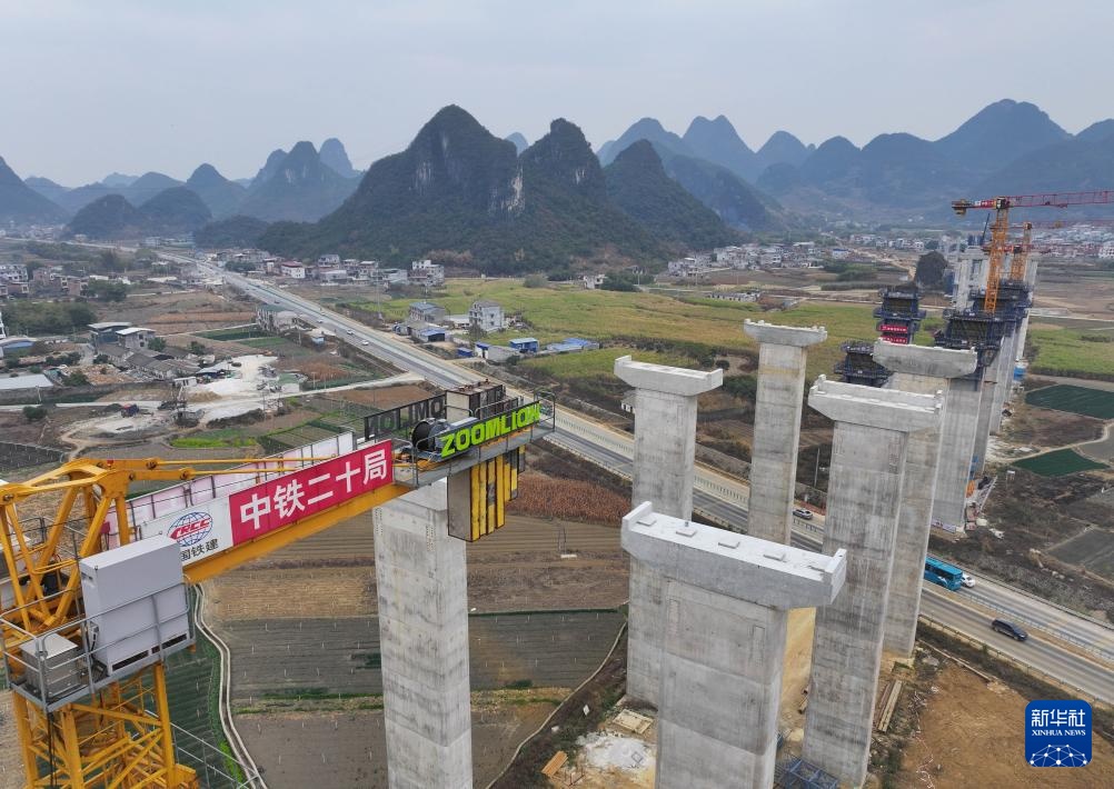 中铁二十局的工人在柳州市柳江区三都镇鱼宜高速公路建设工地作业(无人机照片,1月23日摄)。
