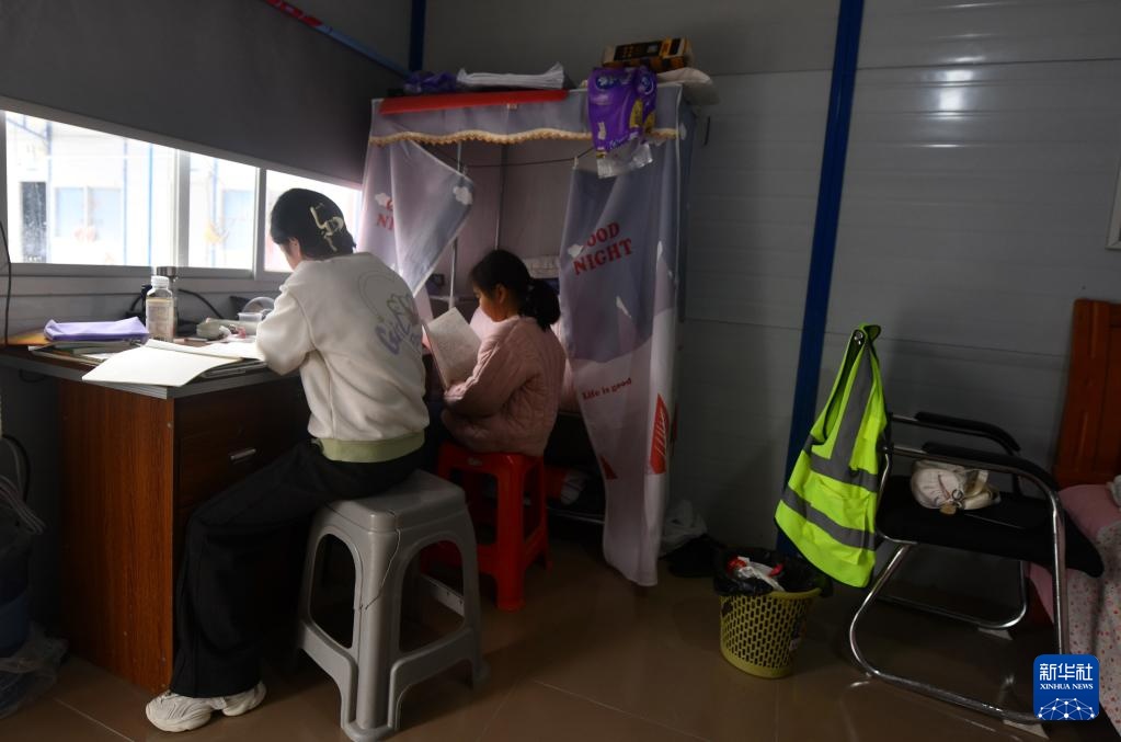 在柳州市柳江区三都镇鱼宜高速公路建设工地,今年11岁的陈艺苗(左)在爸爸的宿舍里写作业(1月23日摄)。