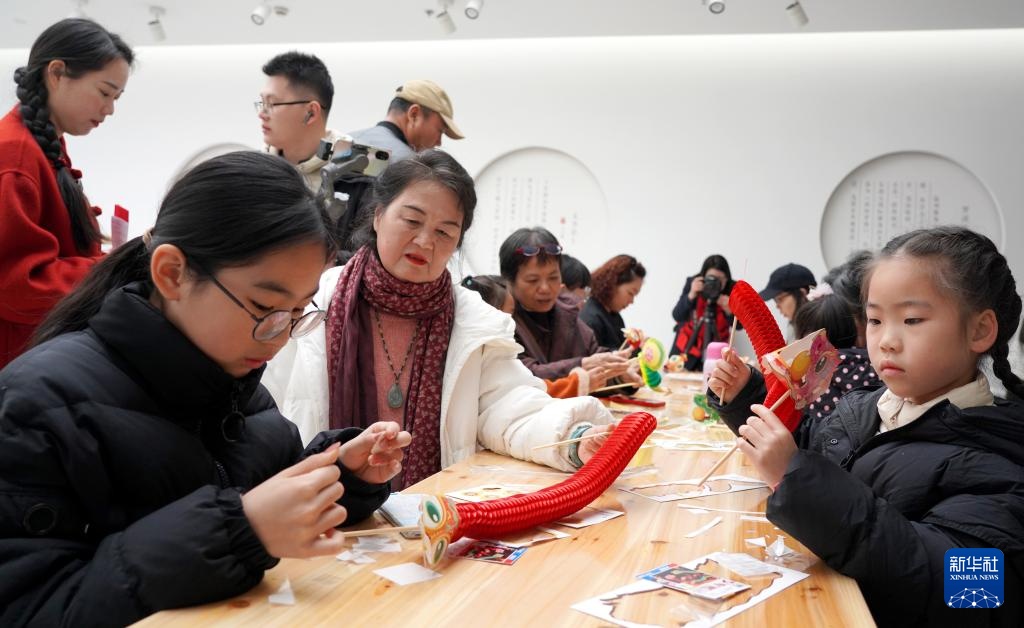 1月23日,在浙江省乐清市非物质文化遗产馆举行的“非遗文化迎新春”活动中,小朋友在制作手工蛇。
