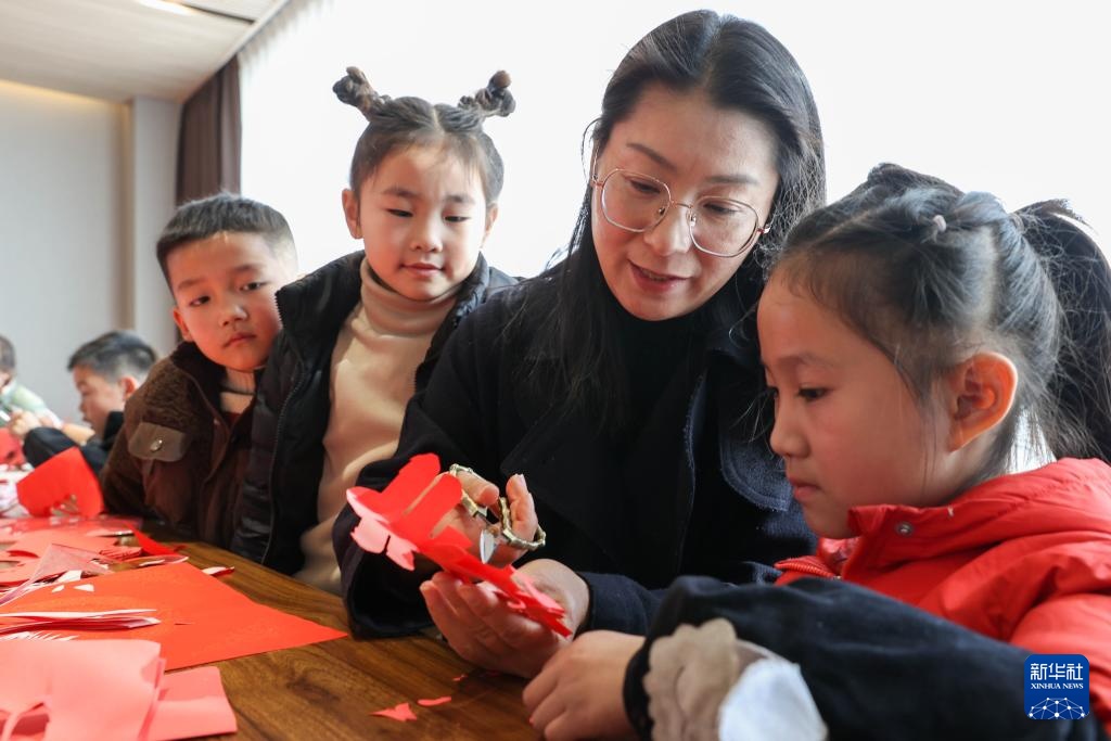 1月22日,浙江省湖州市德清县洛舍镇开展“传承非遗迎新春”活动,孩子们在志愿者指导下学剪纸。