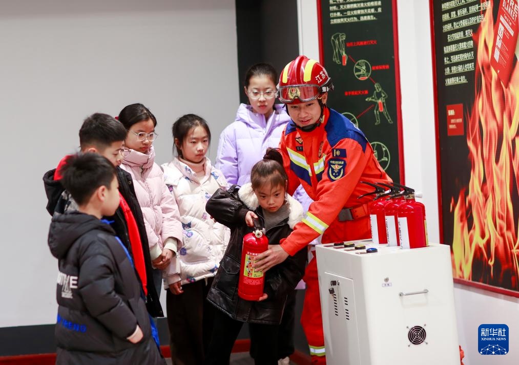 1月23日,在江苏省兴化市安全文化教育体验基地,小朋友在兴化市消防救援大队消防员的指导下进行消防软梯攀爬体验。