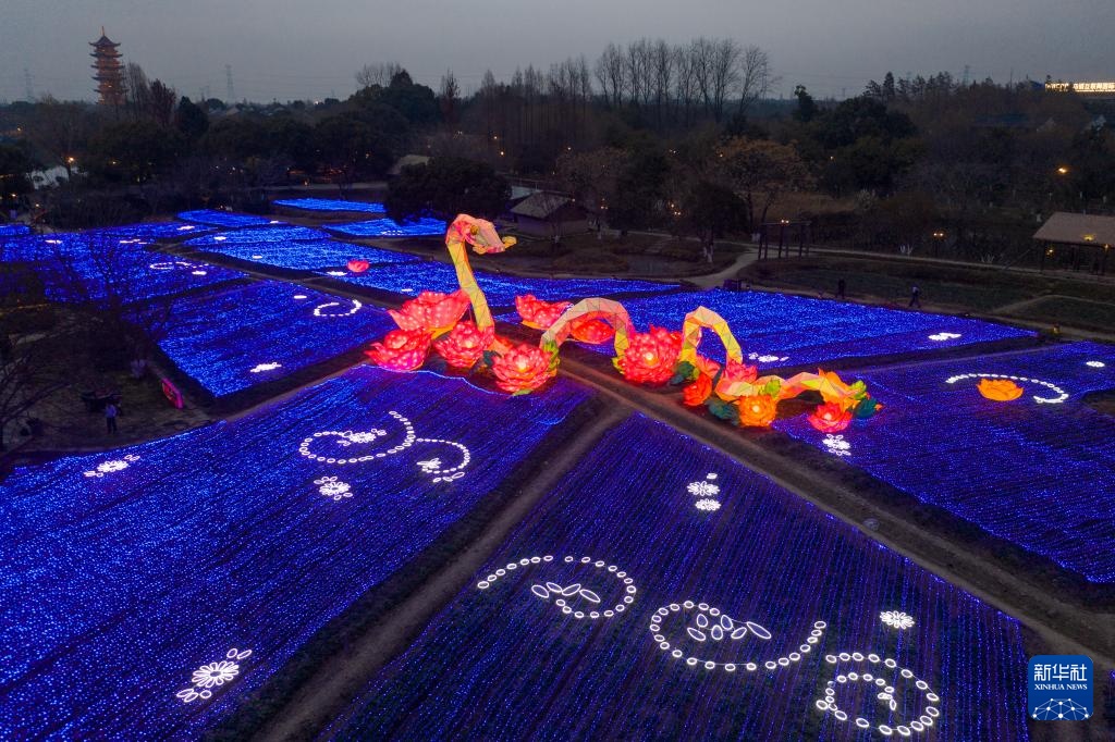 1月23日拍摄的乌镇景区龙形田的蛇年组灯(无人机照片)。
