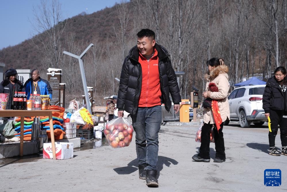 1月18日,在太子岭滑雪场所在的四川茂县南新镇安乡村,游客购买了当地特产。来太子岭滑雪场旅游的游客带动了当地旅游市场。