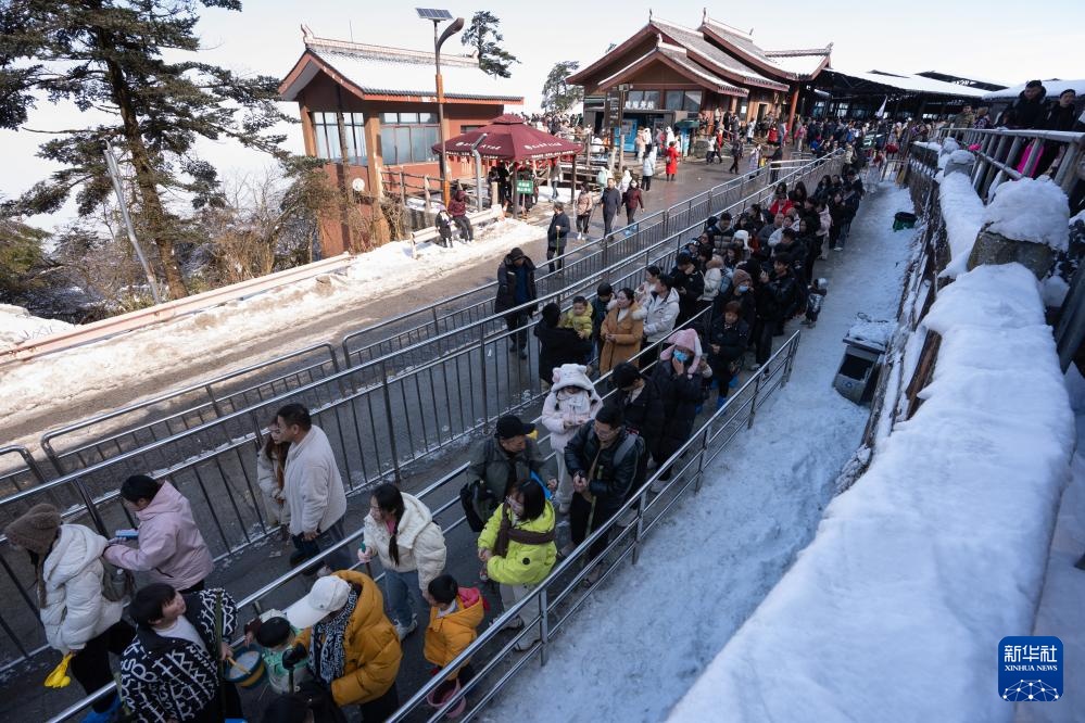 1月12日,在峨眉山景区,游客从接引殿排队乘坐缆车前往金顶。