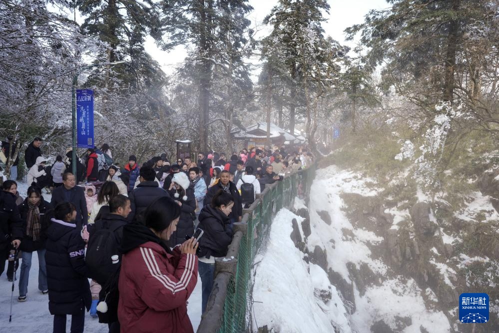 1月12日,在峨眉山景区,游客从雷洞坪景点徒步前往接引殿,中途冰雪景观丰富。