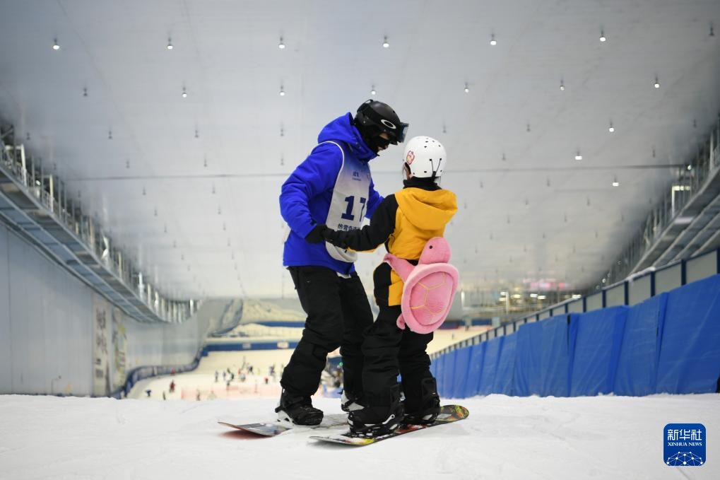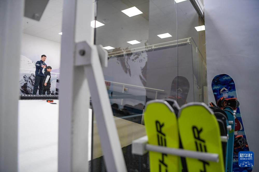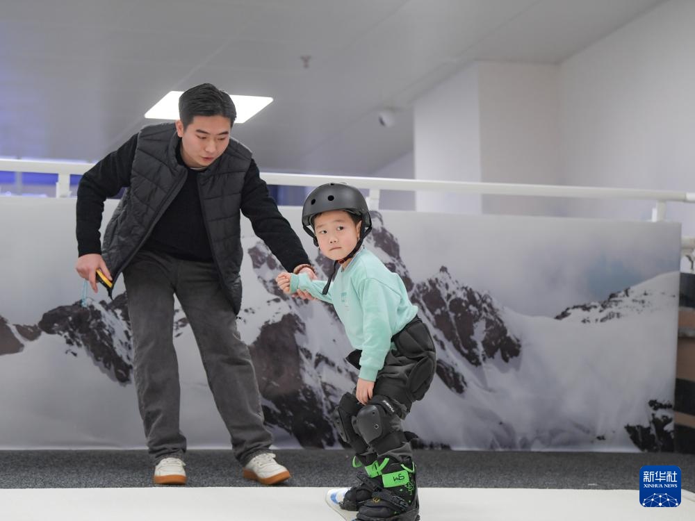 在成都凯德天府广场的一家滑雪体验店里,5岁小朋友毛豆在教练沈旭光的指导下练习滑雪(1月9日摄)。