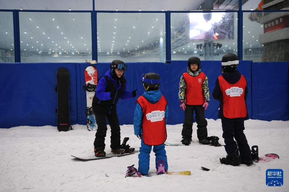 1月12日,在成都热雪奇迹室内滑雪场,教练员向小朋友讲解滑雪技巧。