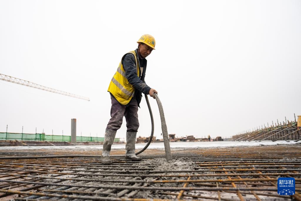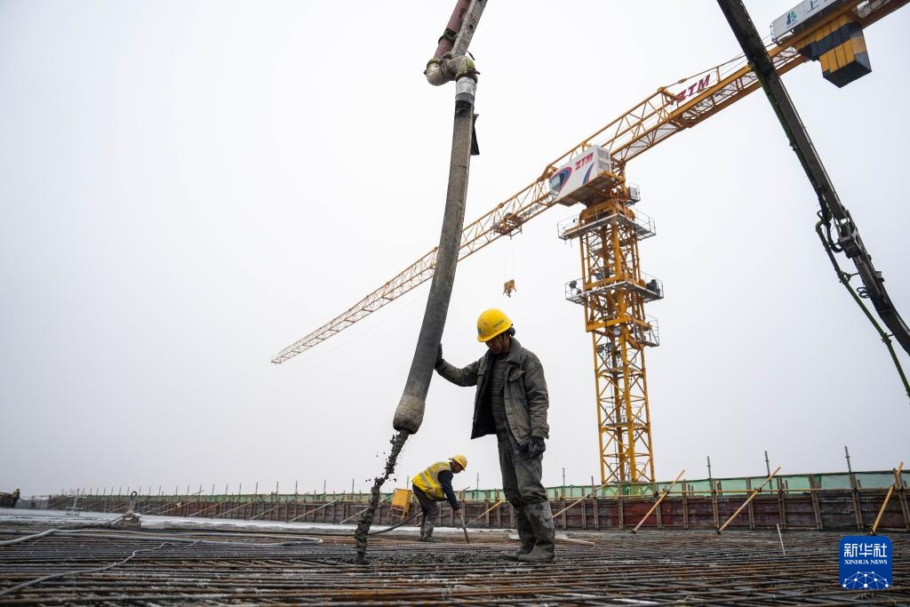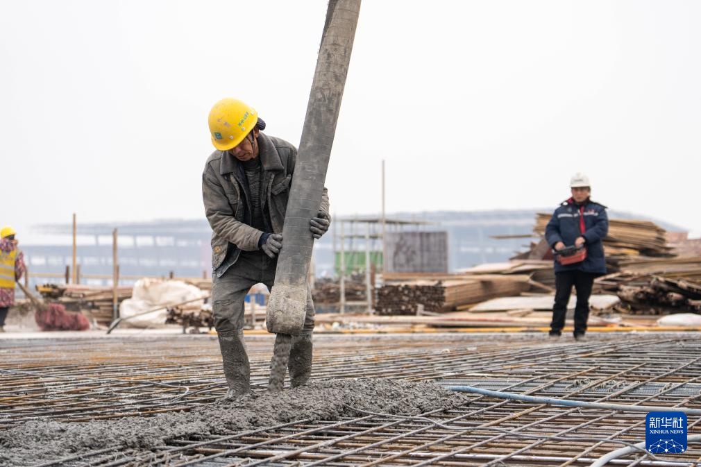 1月24日,在长沙机场改扩建工程T3航站楼施工现场,中建八局工人浇筑混凝土。