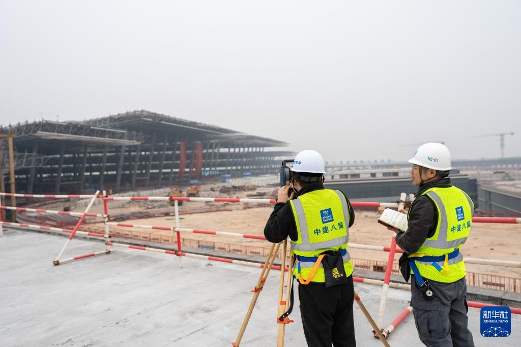 1月24日,在长沙机场改扩建工程T3航站楼施工现场,中建八局技术人员对航站楼网架进行日常变形监测。