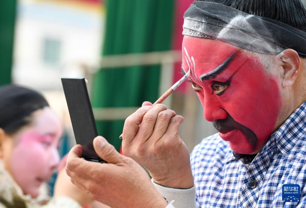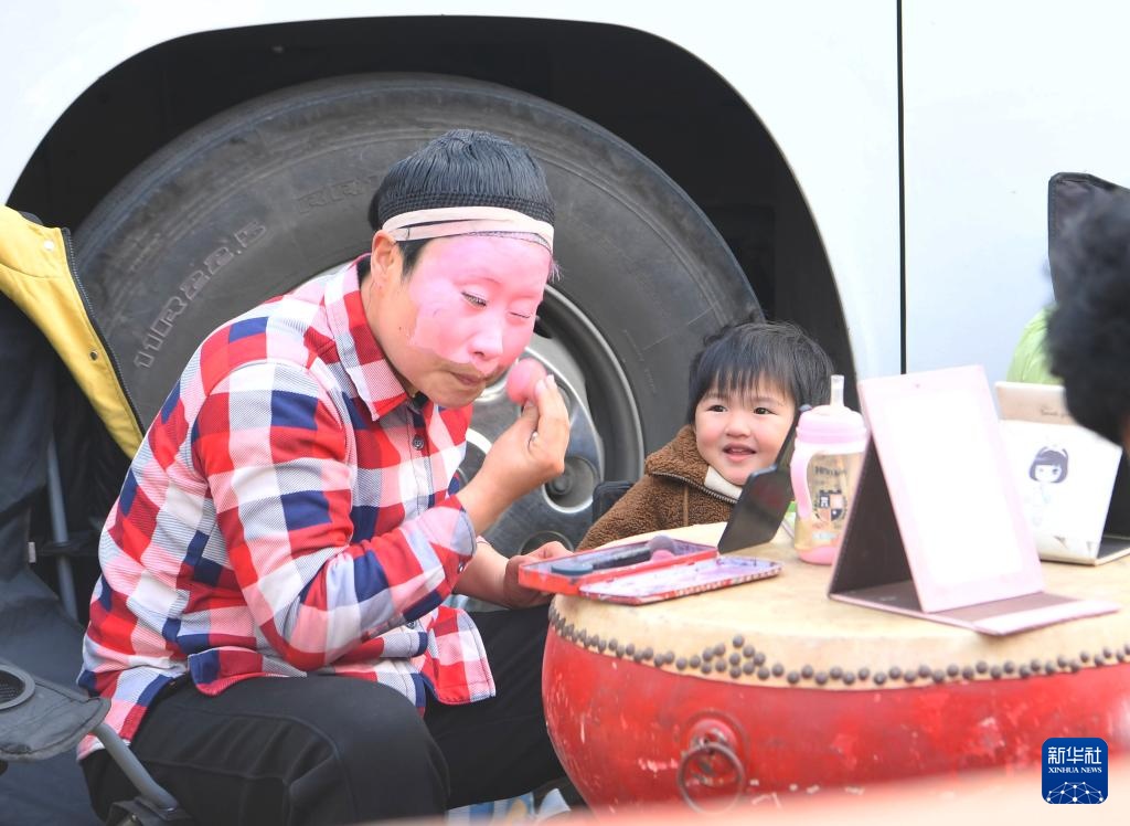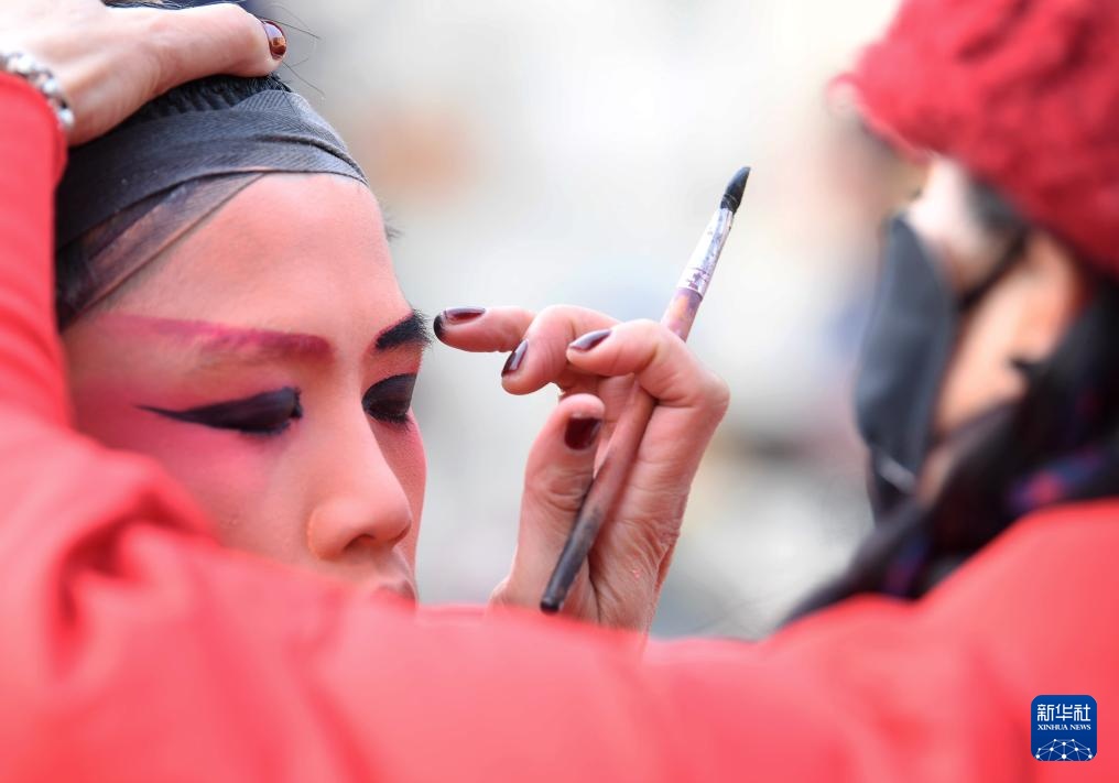 1月21日,在河南省邓州市十林镇大池村,宛梆剧团演员在台下化妆。