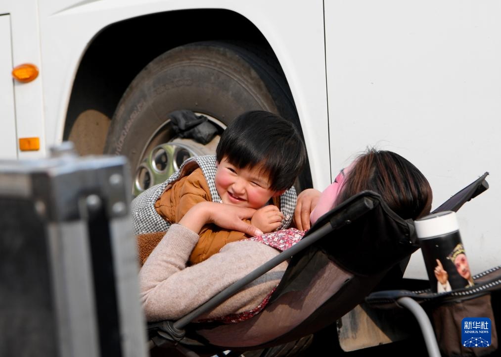 1月21日,在河南省邓州市十林镇大池村,宛梆剧团演员冀珍珠与女儿在玩耍。