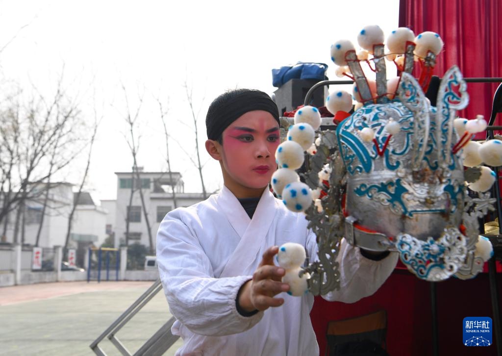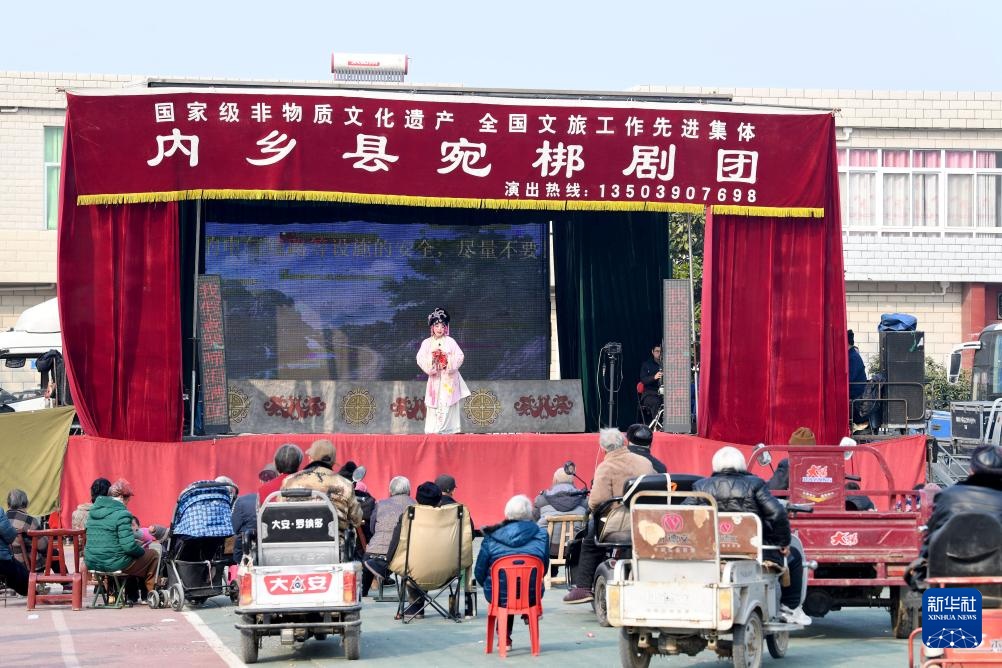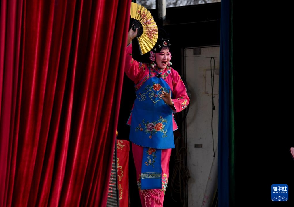 1月21日,在河南省邓州市十林镇大池村,宛梆剧团演员在舞台上表演。