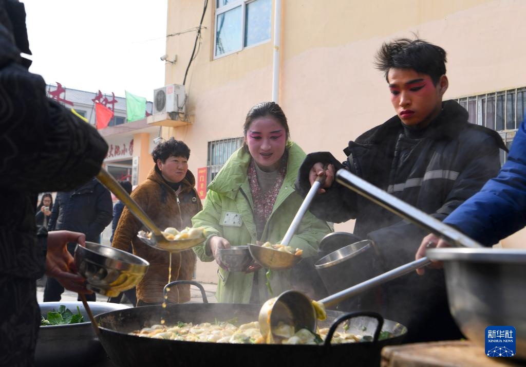 1月21日,在河南省邓州市十林镇大池村,宛梆剧团演员在排队打饭。