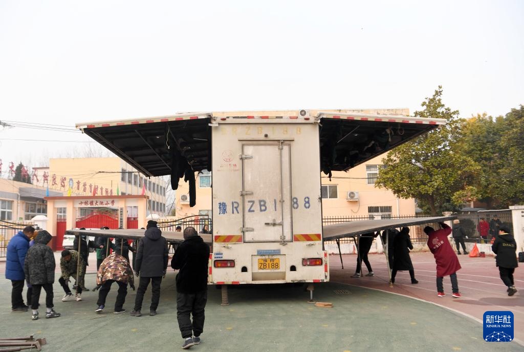 1月21日,在河南省邓州市十林镇大池村,宛梆剧团演员在搭建舞台。