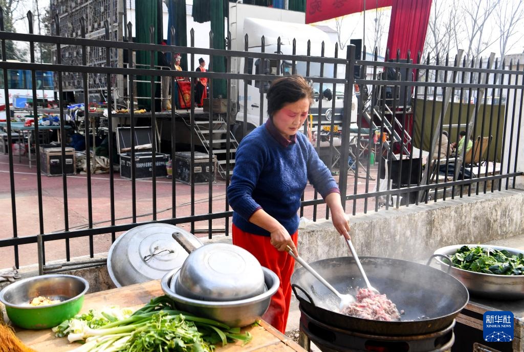 1月21日,在河南省邓州市十林镇大池村,宛梆剧团演员杨玉洁在表演结束后开始做饭。