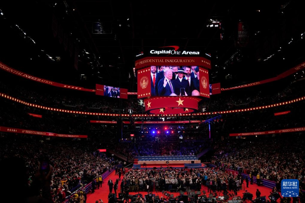 1月20日,在美国首都华盛顿第一资本体育馆,人们观看美国第47任总统就职典礼的转播。